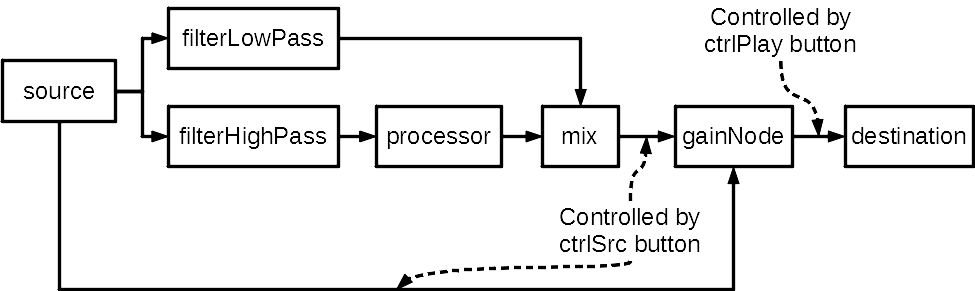 如果要對音訊加上一些效果,甚至進行自訂的編輯,就需要透過 Web Audio API 來達成。他的基本概念是,把輸入、輸出、及各種音訊操作都看成是節點,只要把節點適當的串接起來,就可以達到許多複雜的效果。需要注意的是,目前(2019 年初)這是一個實驗性功能,因此在部分瀏覽器上(如 IE 等)可能仍不適用;而若在使用 Chrome 等瀏覽器測試範例時碰到問題,則可以換用 Firefox 或其他瀏覽器試試看。